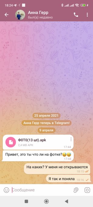 Меня сегодня пытались видимо взломать. Пришло сообщение и папка. Ума хватило, уже наслышана, написала знакомой в ватсап. Мы с ней практически не общаемся. И она написала что её взломали. Будьте осторожны
