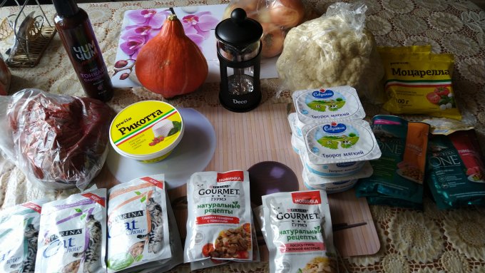 Что-то меня сегодня понесло опять на кухне. Началось с того, что япошлазабирать интернет заказ. Купальник и шапочку . В итоге зашла на новый рынок там прикупила печень оовяжью, потом путь мой лежала хозяйственный магазин, решила поменять коврики на стол. В итоге прикупила новый пресс для кофе. А потом что-то захотелось зайти в магазин и купить цветной капусты и моцарелла. Называется за хлебушком зашла. Итог: тыква, капуста, укроп, рикотта, корм для кошки, соус для мяса. Приготовила суп-пюре из тыквы и цветной капусты, на подходе перец фаршированный, печень на ужин, а ещё мне надо кпбосково- баклажановый тортик сделать. Боюсь не успею до вечера.