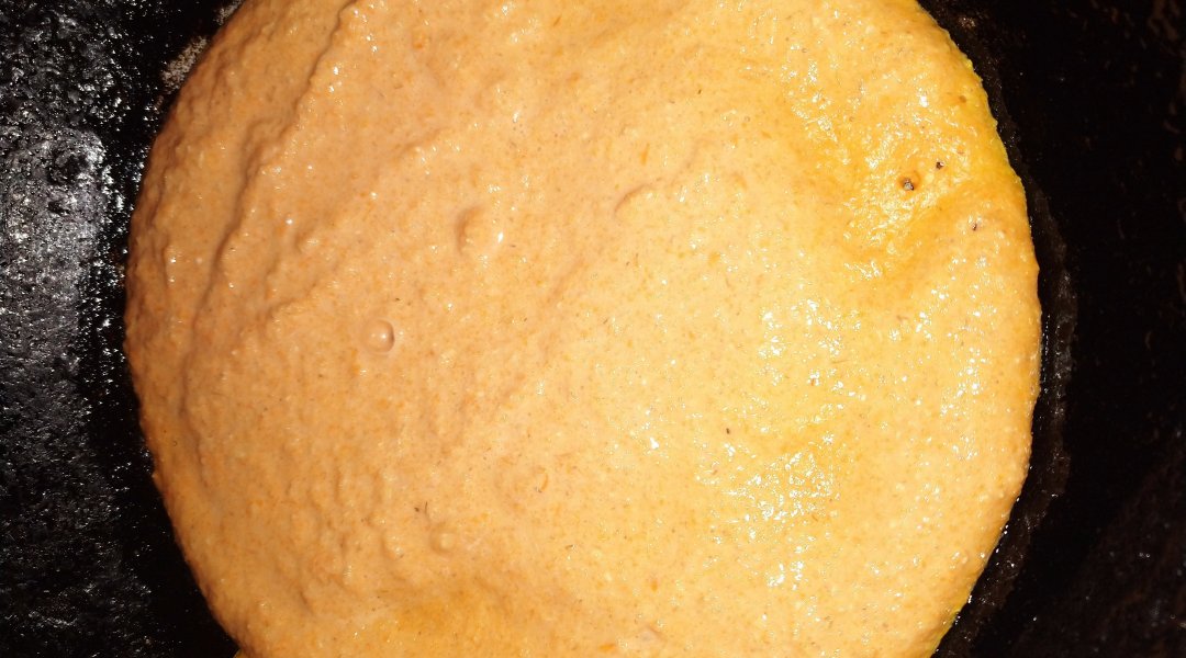 Как следует разогреть сковородку и вылить массу. Жарить до хорошего высыхания нижней стороны, чтобы не сломать. Переворачиваем и ждём когда схватится.