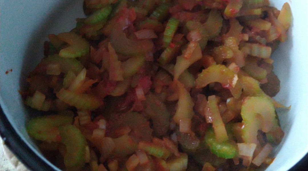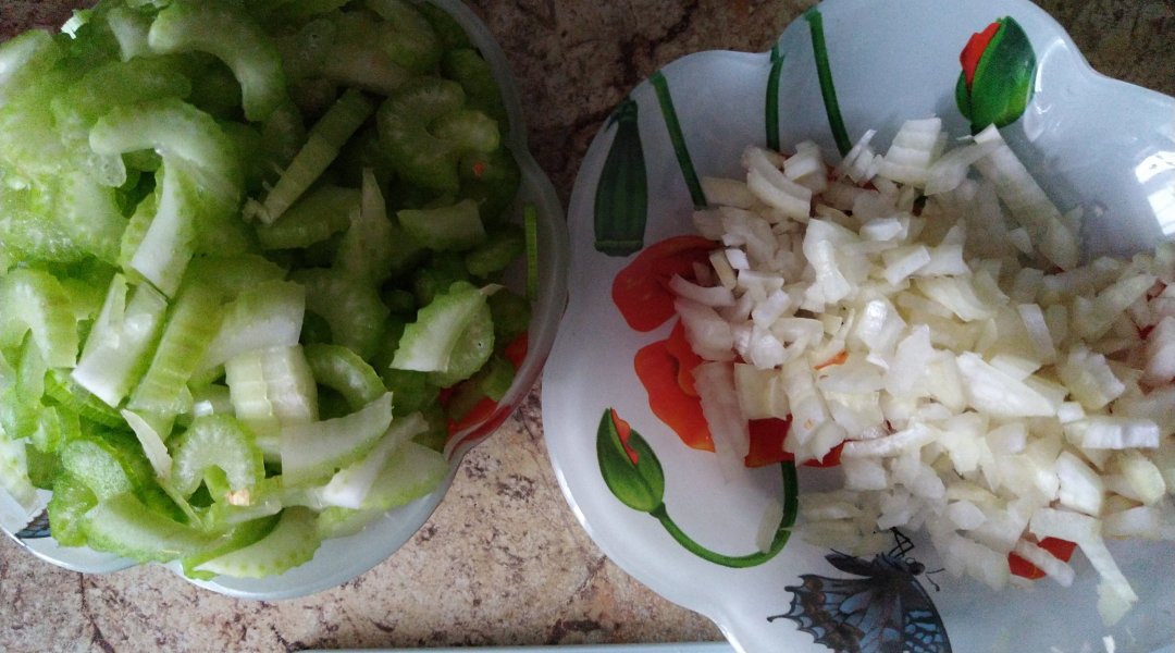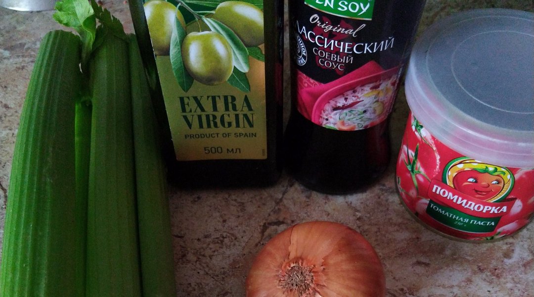 Стебли сельдерея, лук репчатый, соевый соус, томатная паста. Все обжарить на сковороде.