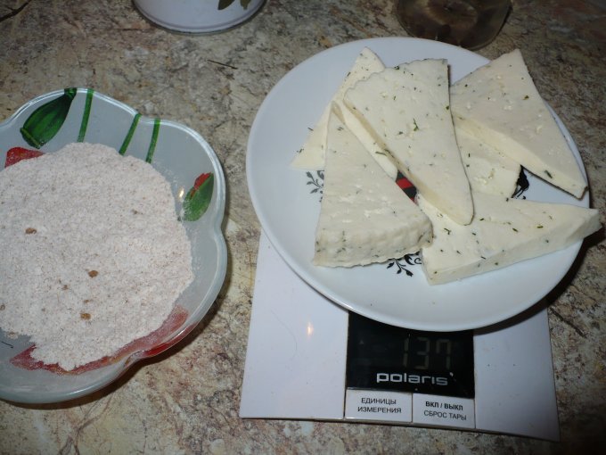 Адыгейский сыр нарезать на ломтики 0.5 см, обвалять в