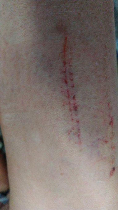 ушиб и небольшая царапина, а так восполилось всё. Отек ещё сильный.
