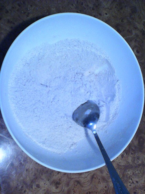 Смешиваем сухие ингредиенты в большой емкости: просеянную муку,