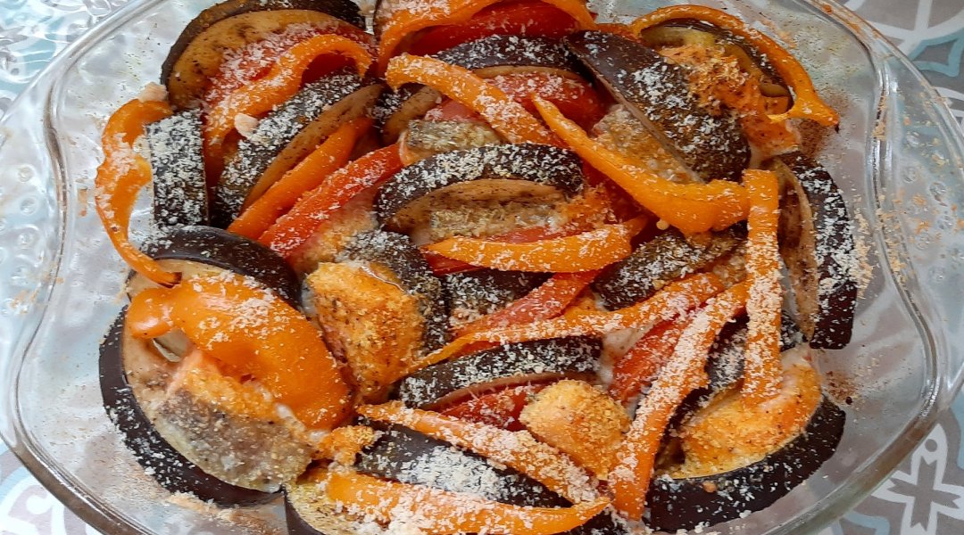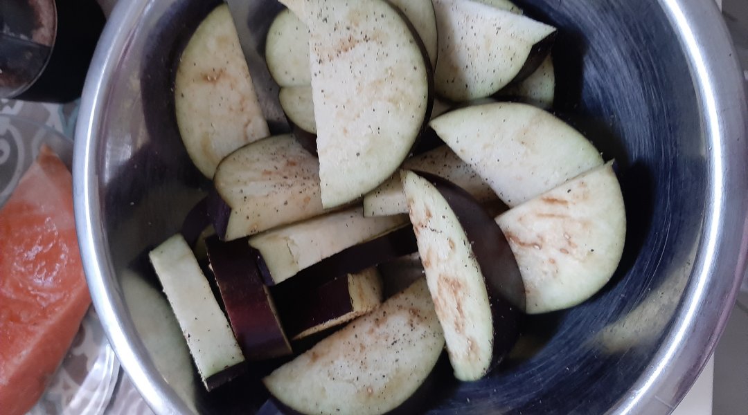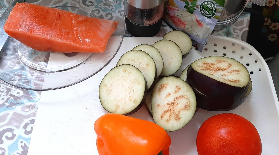 все ингредиенты режем полукольцами, баклажаны и рыбу предварительно посолила поперчила, посыпала специями и оставила на 10 минут.