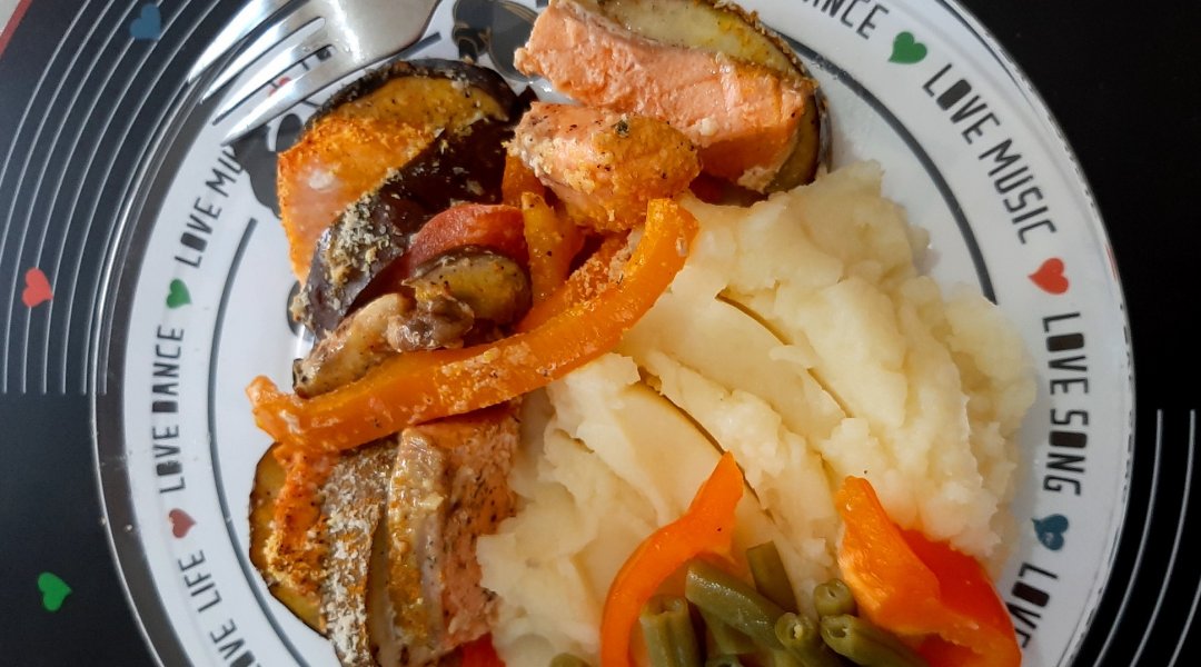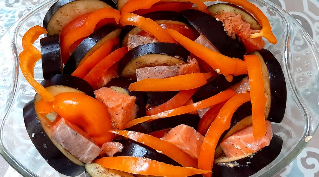 все укладываем в посуду для запекания рядами, баклажан, помидор, рыба, перец, и т.д. В прямоугольной посуде будет идеально у меня овальная форма, получилось, так как получилось.