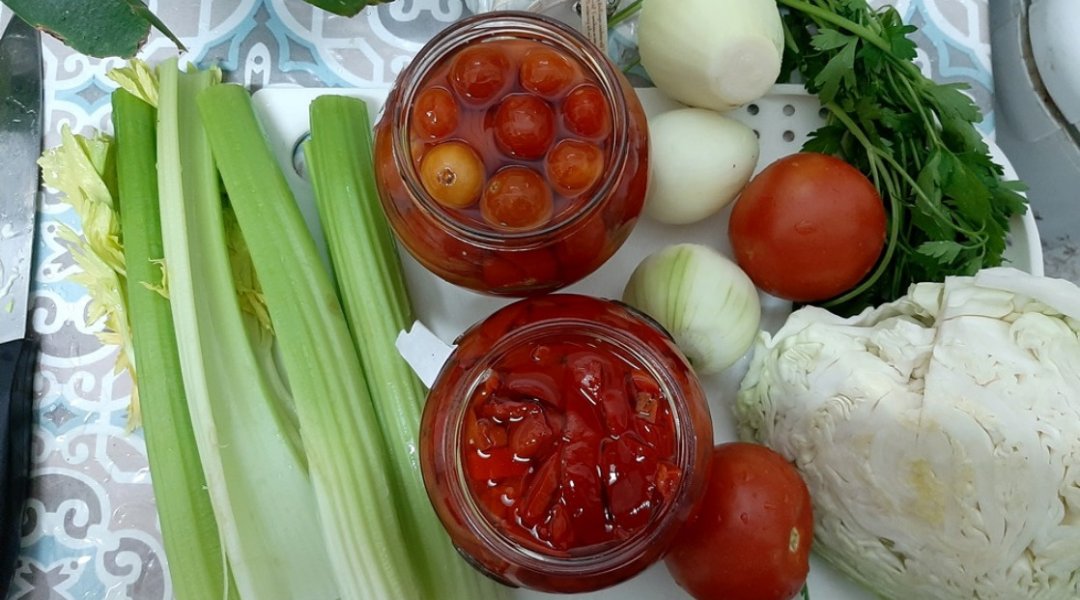 Приготовить необходимые продукты. Капусту, сельдерей, лук и помидор режем кубиками. Я использовала использовала консервированный перец и часть помидор тоже консервированные. Консервированные чери покрупнее разрезала на половинки. мелкие нет.
