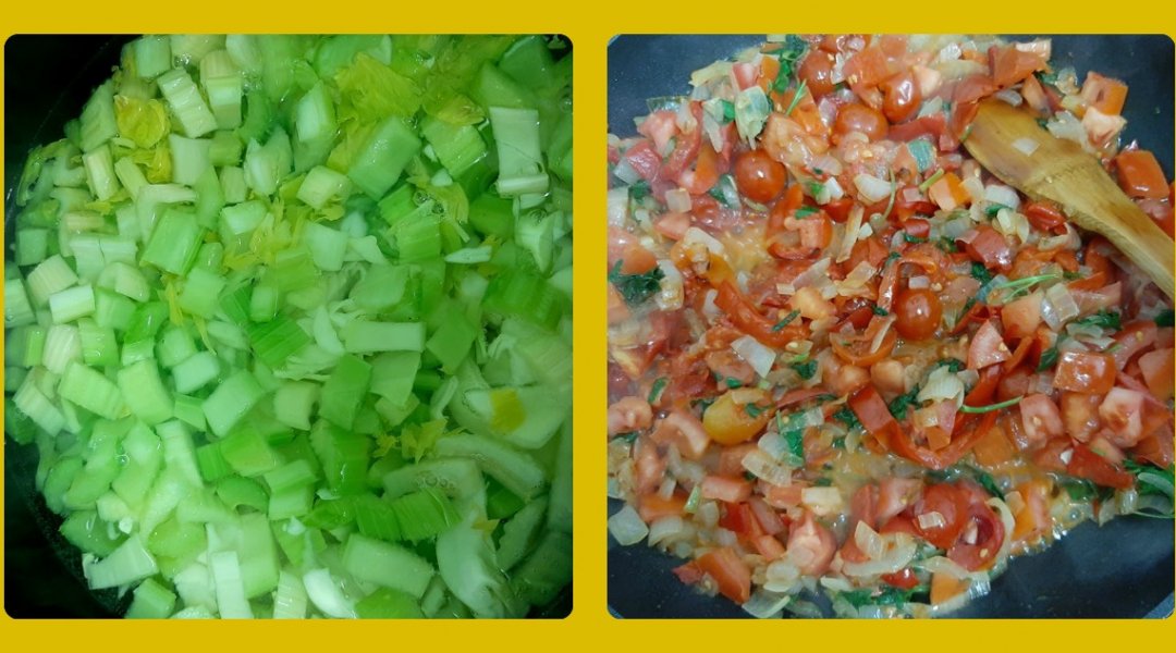 Капусту и сельдерей заливаем водой и ставим вариться, подготавливаем остальные овощи. Лук пассерую на растительном масле, добавляю туда, перец, петрушку, помидоры и минут 10 тушу.
