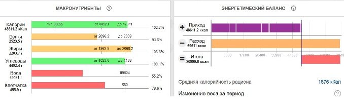 Изменила сегодня настройки и коэффициент активности, уменьшила показатели, а то по прежним показателям, у меня вес должен упасть за 3 месяца на 13 кг, при моем ежедневно потребляемом кбжу, как говорит сайт,  а он стоит на месте... и провела маленький мониторинг своего рациона за ноябрь, незаметно так в день по мороженке и по пироженке у меня добавилось в рацион. Включаю им красный свет.. а то уже чувствую, что не комфортно мне становиться от такого питания..