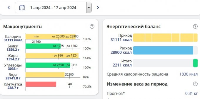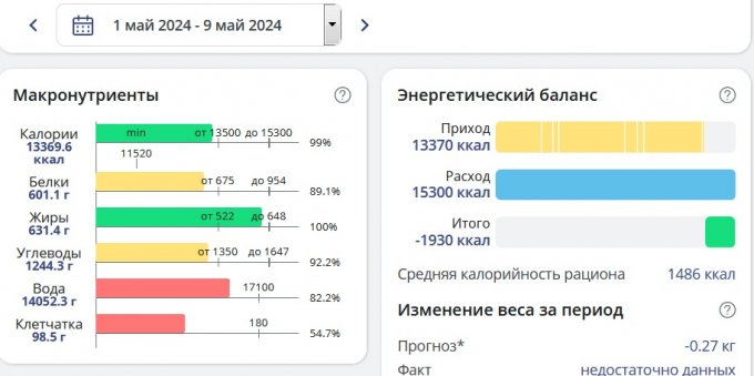 Оказалось мне трудно продержаться 2 месяца в ограничении , то что мне с трудом далось в апреле за месяц за половину апреля вернулось.  Опять вечерние перекусы, жиры, мороженое и т.п. средняя калорийность за полмесяца выше 1800 ,  в марте была 1680.  Опять живот начал расти (который спал в марте на 6 см) . Не довольна я собой. отсутствие дисциплины, хаотичные приемы пищи, вредная еда, перекусы ... как собраться опять..   перестала принимать хлореллу, габу и пить уксус в этом месяце, может  меня уксус и бады стимулировали и отбивали аппетит. как то тяжелее отказаться от еды и пропустить перекус..  сегодня еще состояние разбитости.. тяжело собраться с мыслью..