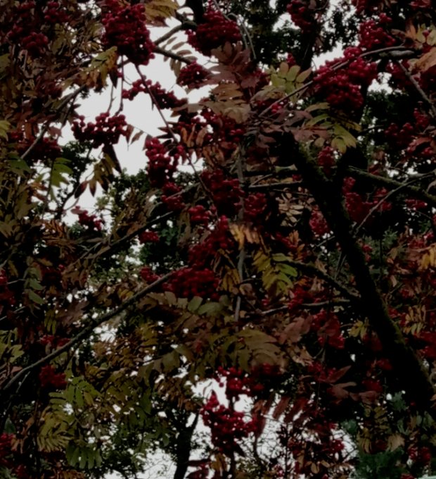 Осень у нас еще без золотистых листьев, деревья только только начинают желтеть, только ягодки рябин покраснели