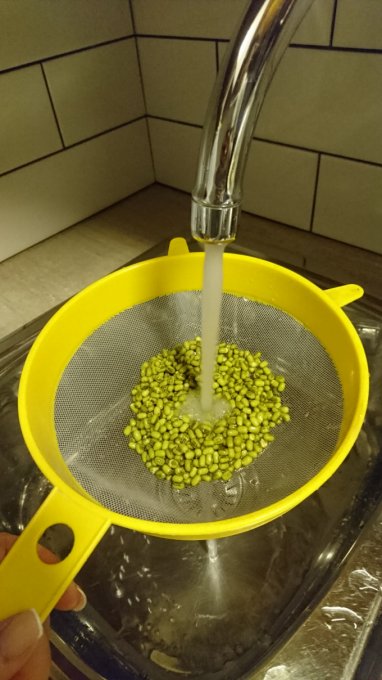 Содержимое ёмкости выливаю на сито и промываю водой комнатной