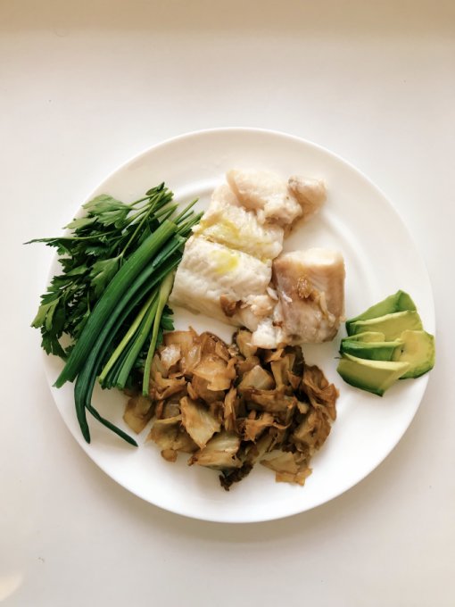 Обед в 11:00 - тушеная в мульварке белокачанная капуста на поджаренном луке, чесноке и имбире. Палангасиус запеченый в пароварке с солью и лимоном. ПРи подаче сбрызнула лимонным соком и маслом авокадо. Также добавила нарезанное авокады и зелень: лук и петрушка. Ну что сказать, это было божественно!!!!!