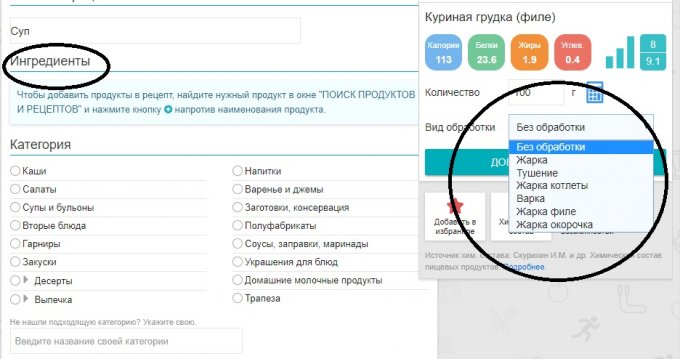 калорий? Или когда набиваешь состав рецепта (ингредиенты) - то