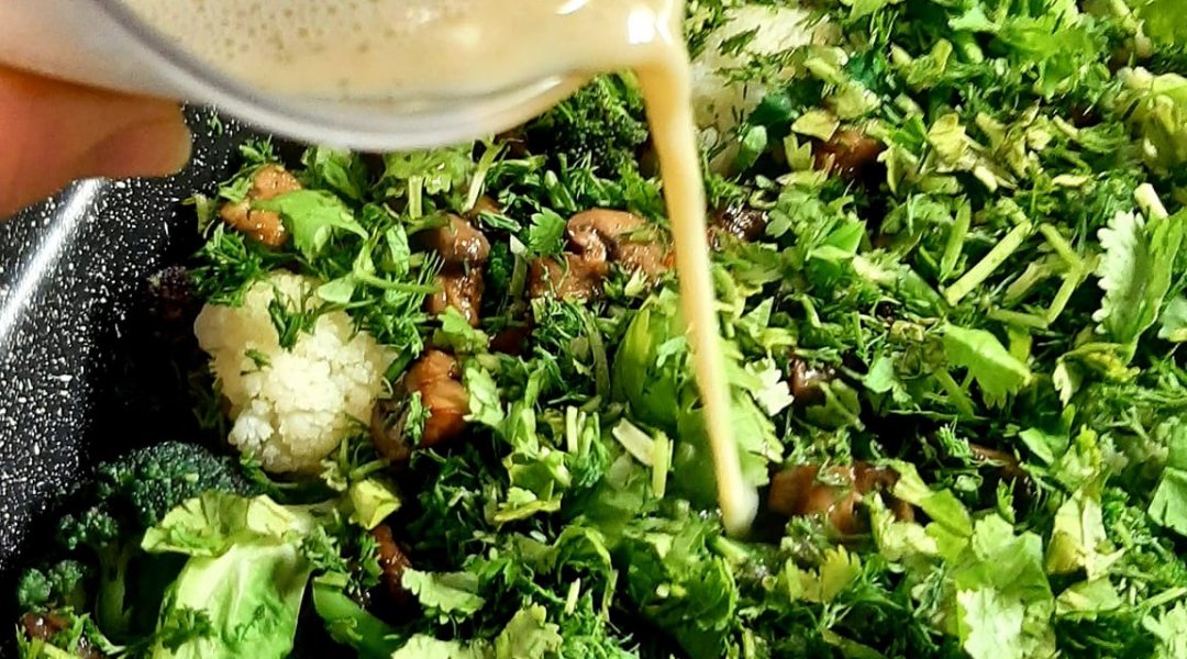 Присыпаю зеленью и после этого - заливаем яичной смесью, накрываем