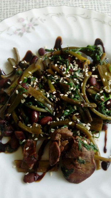 | Стрелки чеснока и лука с фасолью и куриной печенью |