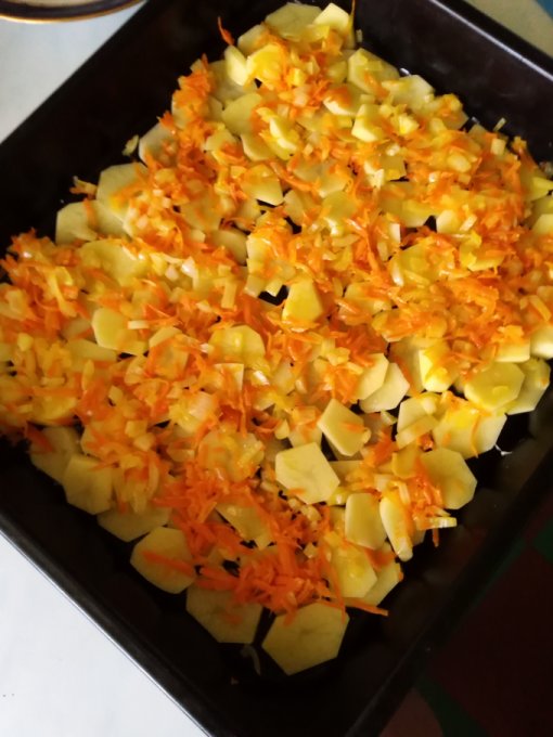 Выложить лук с морковью на картофель. Посолить, поперчить.