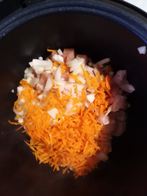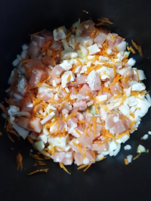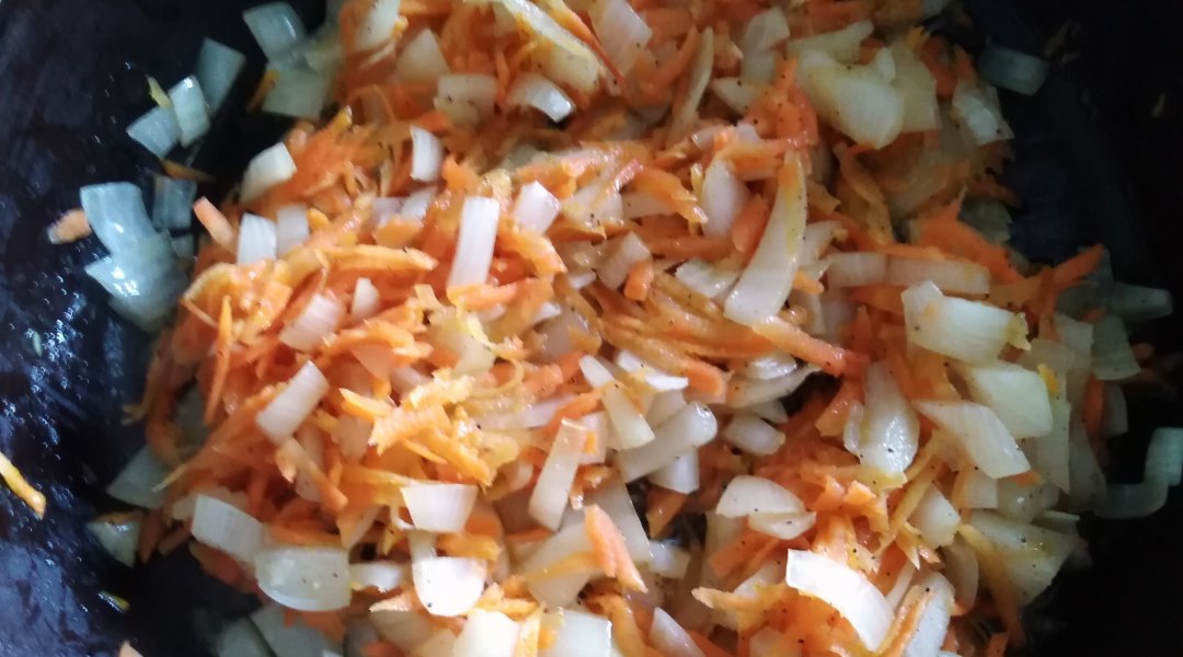 Мелко порубить лук, натереть на крупной тёрке морковь. Обжарить на сковороде.