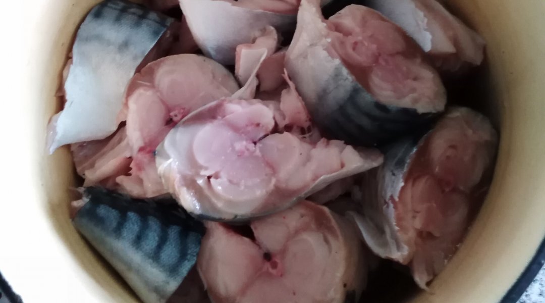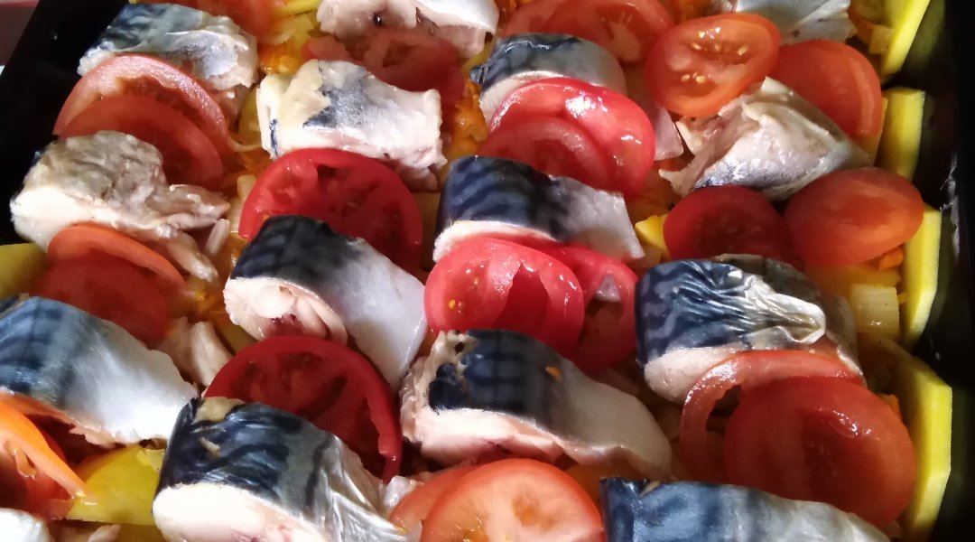 Почистить овощи. Нарезать картофель дольками и выложить на противень смазанный сливочным маслом. Почистить скумбрию, порезать на порционные кусочки.