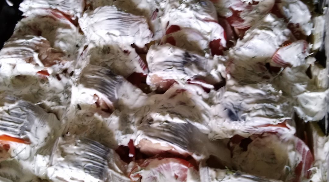 Приготовить соус. Смешать сметану и майонез, добавить мелко рубленую зелень.