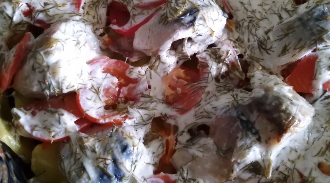 Ну очень вкусная и нежная рыбка! Запечённая с овощами под сметанным соусом))