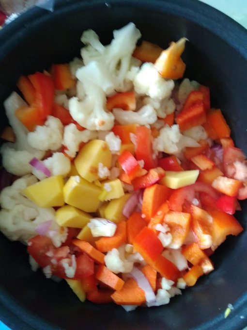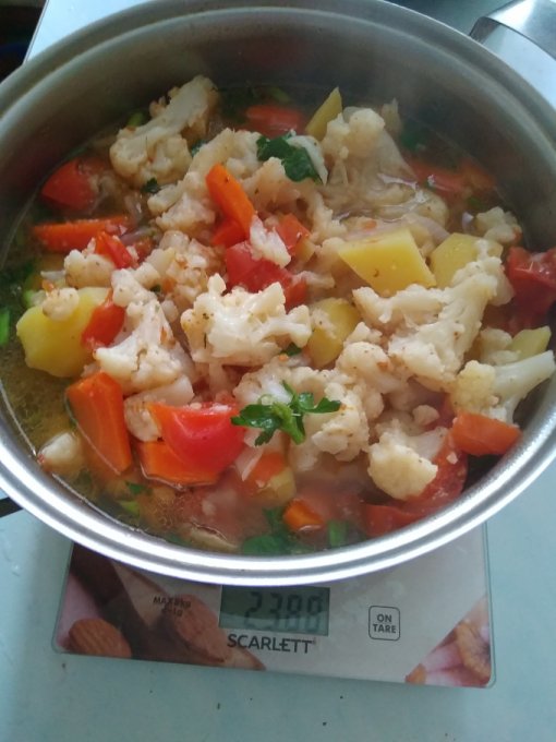 Промыть замороженную цветную капусту, заложить в мультиварку. Картофель крупными дольками, туда же. Морковь и лук крупно порезать и в мультиварку. Помидоры и красный перец порезать не крупно и тоже в чашу мультиварки. Посолить, поперчить. Залить водой, добавить подсолнечное масло . Включить режим тушение на 50 минут. За 5 минут засыпать порубленную петрушку. Приятного аппетита!)))