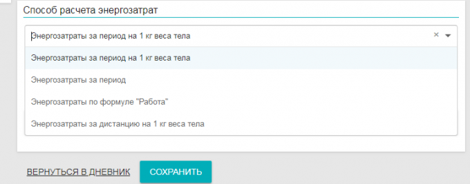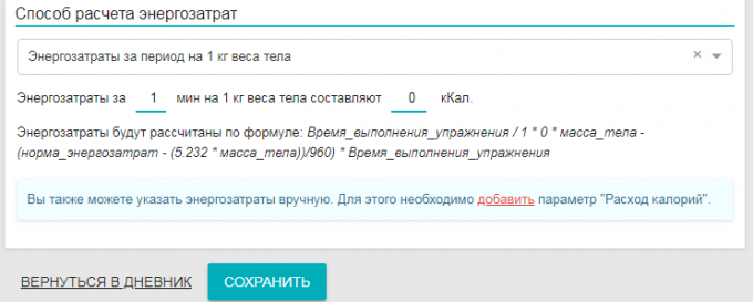 В меню создания упражнения, в самом низу, есть селектор выбора режимов учёта энергопотребления, и сразу формула расчёта идёт, и это всё можно самому выставлять. Формулу можно частично редактировать.