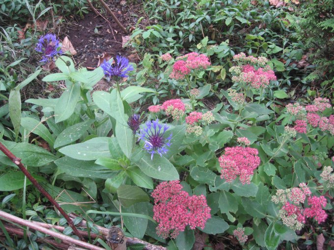 Еще с вечера вчерашнего разболелась голова,- давление поднялось до 150.  Всю ночь не спала. Уснула только часов в 6. Созвонилась с врачом, пообщалась.  Всему виной стресс, в котором я уже давно живу, и погода. С первой проблемой связаны и обострение гипотиреоза и  набора веса.  Сегодня уже вес 77.7.  Посоветовала пока отказаться от приема в пищу семена льна, так как он блокирует всасывание йода, что критично для щитовидки. Опять воспалились суставы на руках.  Но не все,-  это радует. Опять мажусь и благоухаю всяческими снадобьями. :хихикаю:  Муж в такие дни меня называет  "мой душистый цветочек".  И все-таки в 11 часов пошла на прогулку. Правда, без палок. Нагулялась до часу дня, пока дождь не пошел.  Осень вступила полностью в свои права.  В цветнике зацвел василек.  И на сирени вдруг проснулись цветочные почки. Вылезло несколько цветочков  на ней. Совсем некстати.