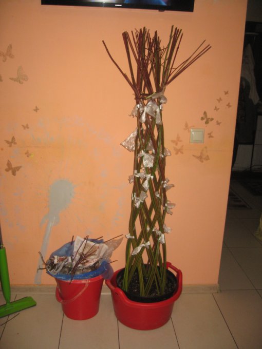 И погода опять не пустила погулять. Занялась творчеством. Воплотила, наконец-то, свою давнюю задумку. Сплела дерево из лозы. На фото - мое дерево, рядом,-  что должно потом вырасти.