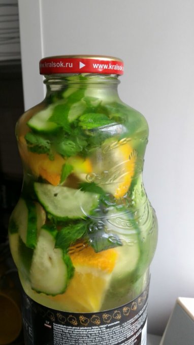 Апельсин, огурец, мята, мелисса и пару долек имбиря. На ночь в