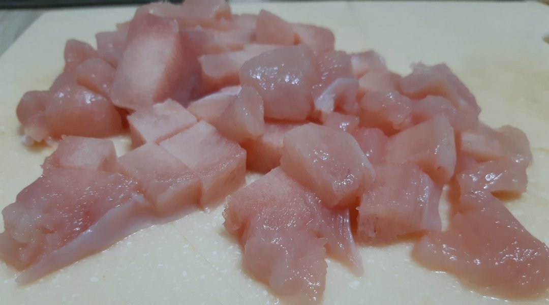 Порезать грудку кубиком или соломкой и сварить до готовности