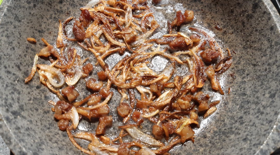В это время выжарить бекон до состояния шкварок и поджарить на вытопленном жире лук.