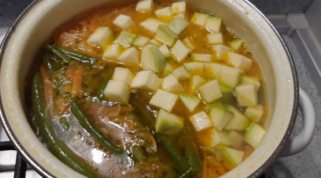 Добавить порезанные соломкой кабачки, посолить по вкусу и варить еще 5-7мин.