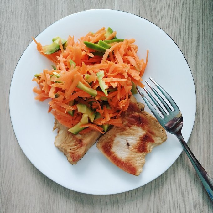 Сагодня делала салат морковь+авокадо. Была бы моя воля, добавила бы тыквенных семечек туда. Но из-за аллергии малыша - увы. На фото индейка.