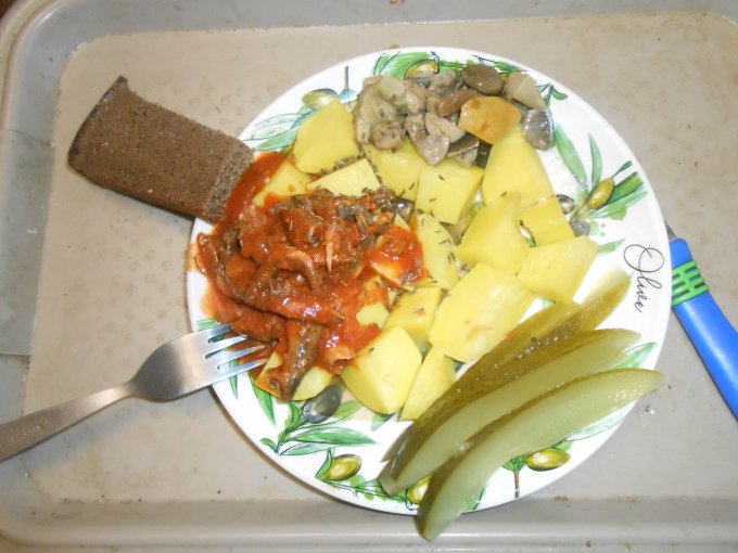 Вот такой сегодня ужин. Прям как в детстве в деревне: картофан кусочками, огурчики, грибочки, килечка в томате по 33 коп. за банку...