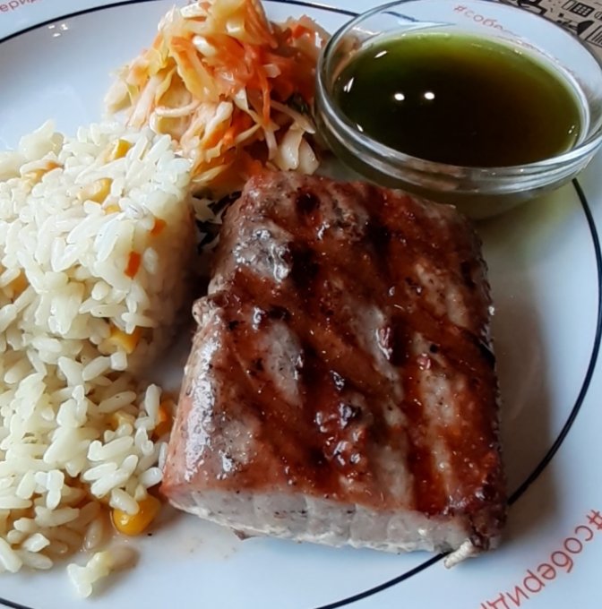 вот заказала себе стейк из тунца, к нему шел гарнир из риса с кукурузой и салатик овощной