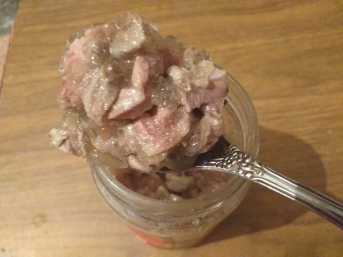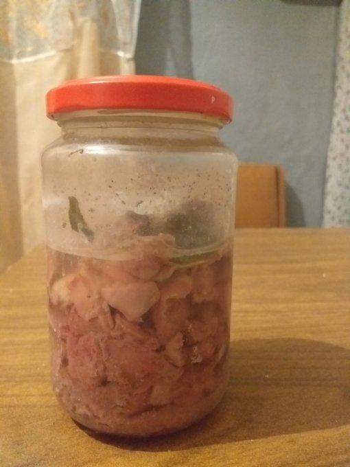 Берете банку от 200 до 500 гр. с завинчивающейся крышкой. Режете довольно мелко мясо( если это субпродукты - помельче, если мясо, то можно и крупней). И плотно набиваете банку, придавливая периодически мясо, чтобы больше влезло, прибавляете пару черных горошков и кусочек лаврового листа где-то в середине банки. Соли немного или вообще без неё. Крышку завинчиваете неплотно. На дно мультиварки кладете тряпочку, ставите банки и наливаете воды по плечи банкам.