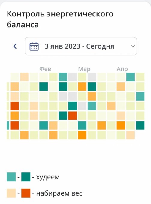 Решила посмотреть отчётность за январь (хотя начала в октябре худеть, но мне лень настраивать с октября). Все желтенькое или светлое, зелёных мало клеточек, однако 3,5 кг ушло. Я это связываю с тем, что в настройках поставила себе отсутствие активности. Хотя конечно я хожу на работу и бегаю по этажам. Почему же я поставила отсутствие? Потому что гулять я хожу редко, по дому не хожу , особо ничего не делаю - пылесосит и моет посуду муж, готовит тоже чаще он.