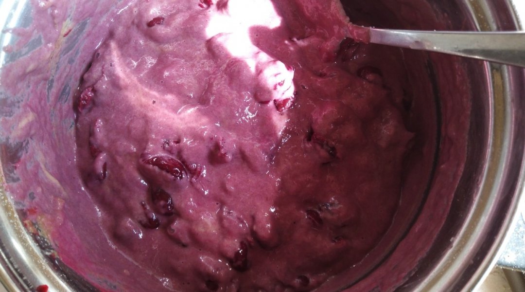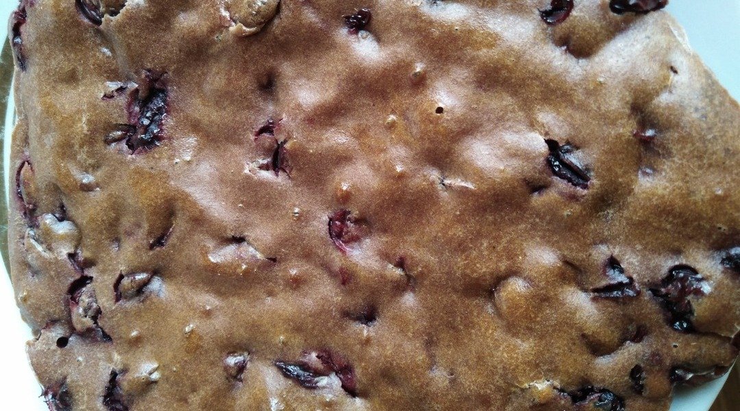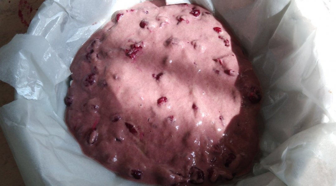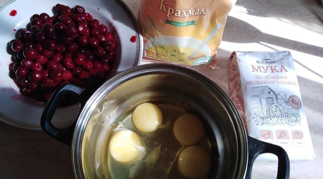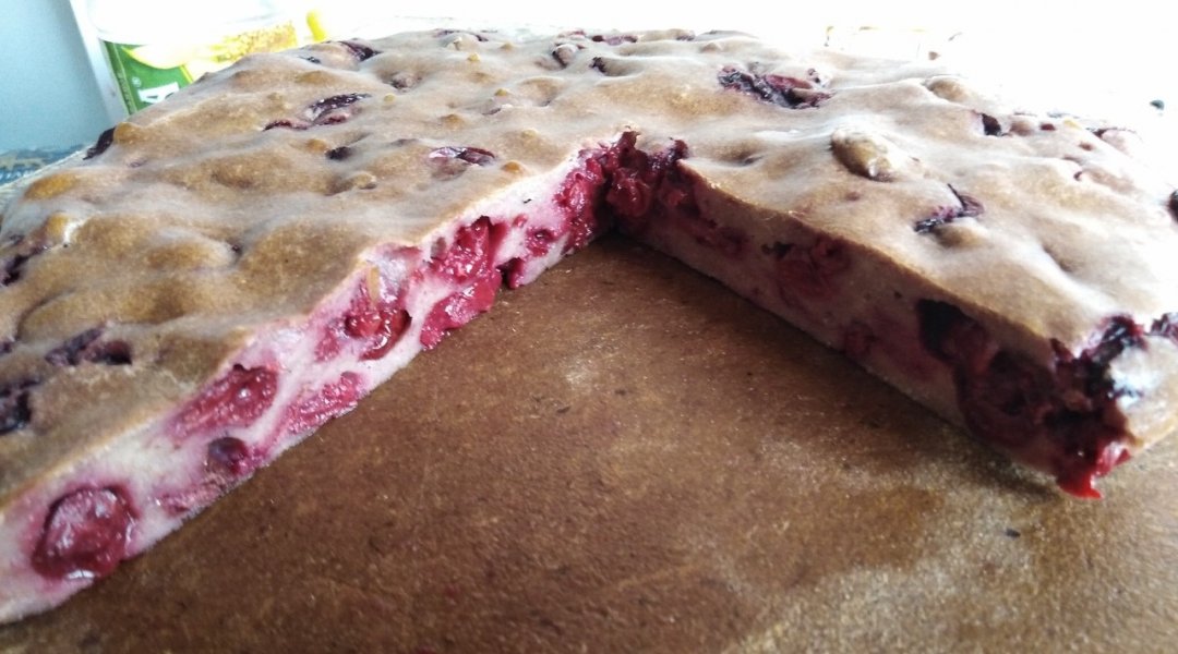 Пирог с вишней на полбовой муке, яйцах, без сахара с добавлением столовой ложки крахмала.