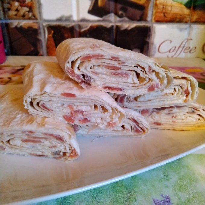 Лаваш разрезать на две полосы. Каждую хорошо промазать смесью и свернуть в рулет.