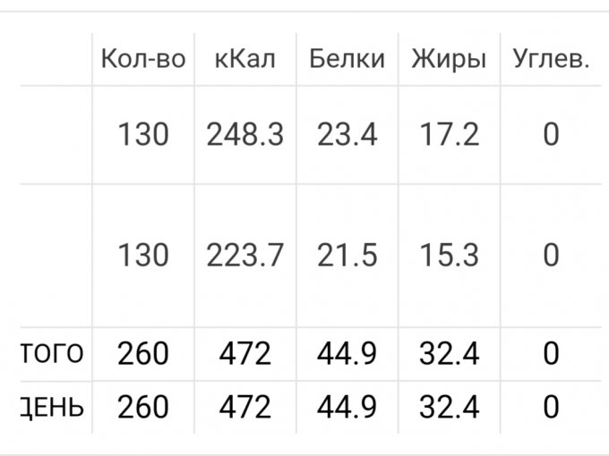 | Кол-во | Калории | Белки | Жиры | Углеводы | |