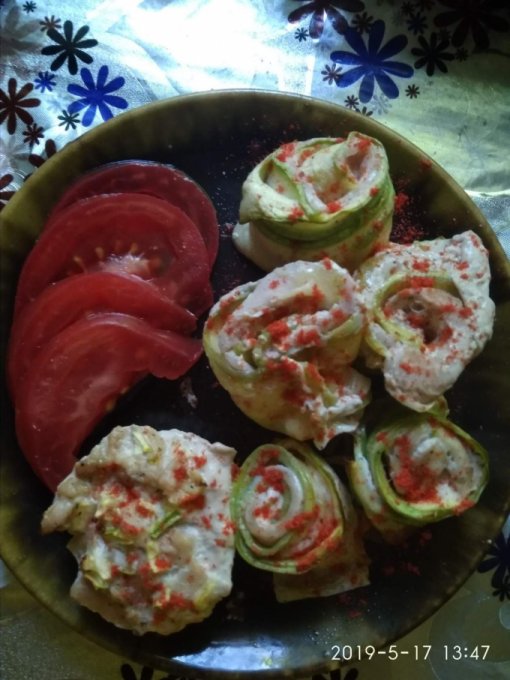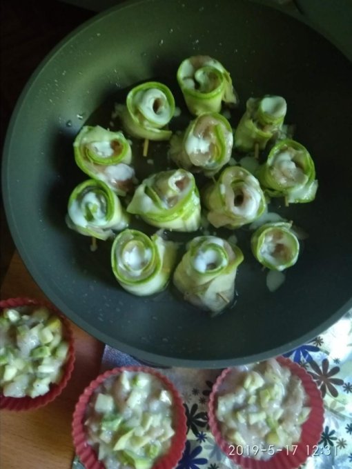 День 49.  Сегодня баловалась готовкой,рулетики из кабачка с куриной грудкой,не  плохо,но остатки измельчила и в формочки ,все запекла,получились котлетки курино-овощные.Еще делала рыбные котлеты с творогом.мне понравилось,даже не ожидала ,такие нежные,эти буду делать почаще,главное просто и минимум продуктов.