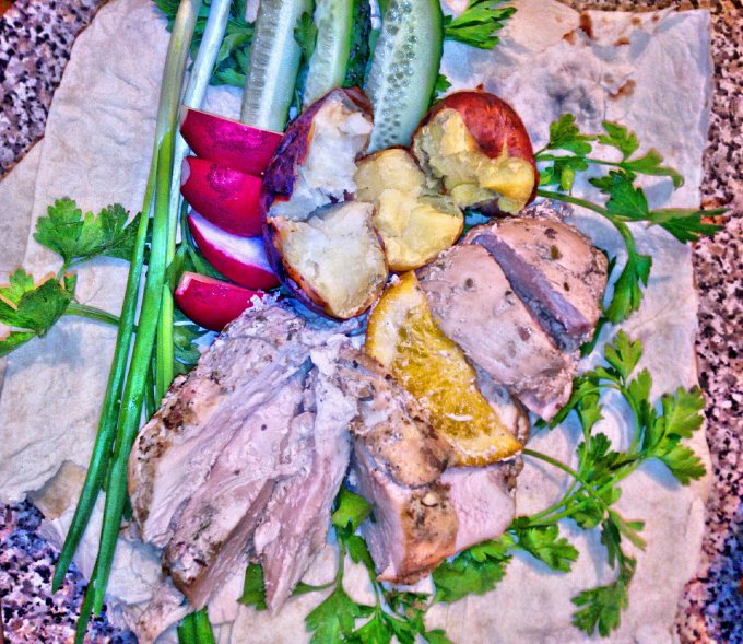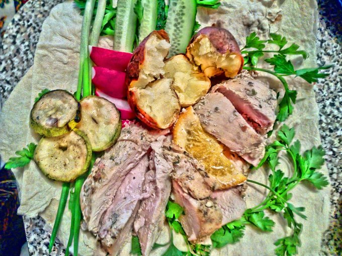 куриное, овощи (картофель, лук маринованный, кабачок), скумбрия.