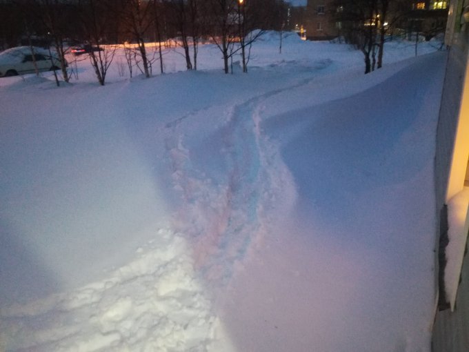 Сегодня занимался раскопками. Что-то нападало снегу за праздники. Еще и потеплело 0 градусов. Снег тяжелый и липкий. 1,5 часа раскопок и 2 такие тропинки были прорыты, послезавтра продолжу восстанавливать цивилизацию)