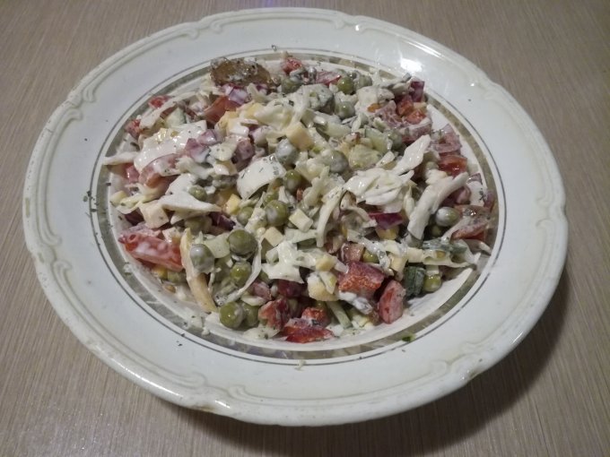 сегодня почему то захотелось сфоткать свой  салатик. Он каждый вечер выглядит примерно так. И каждый вечер прекрасен на вкус и цвет)))