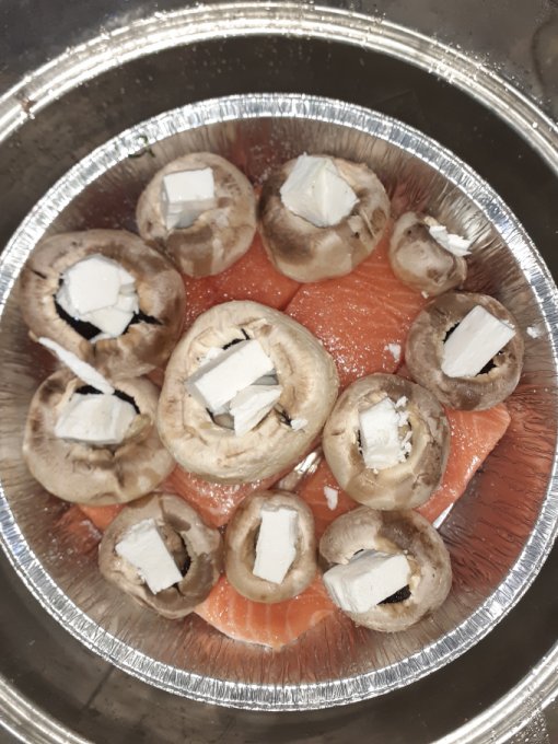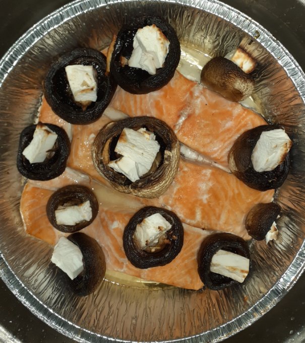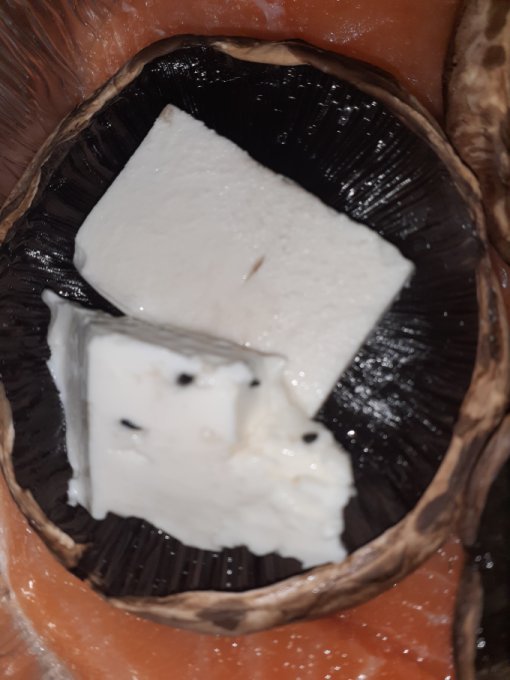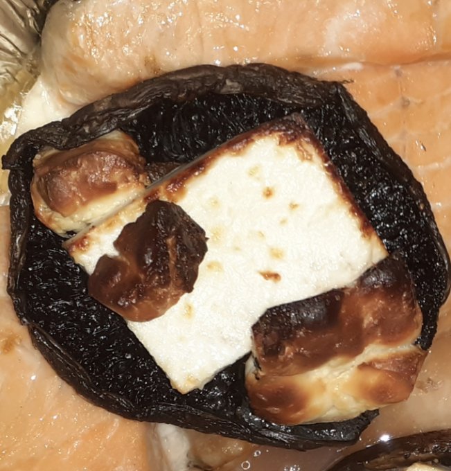 Портобелло гриль, сверху сыр цфатит, только подогреть. Сыры разные один козий, другой обычный. Козий кубиком.