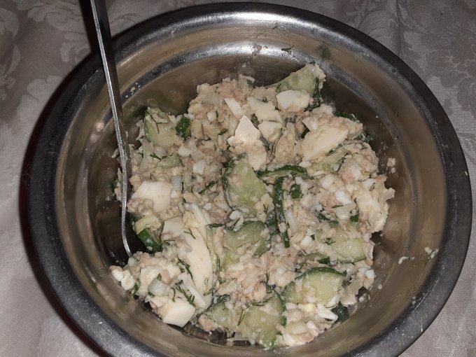 Салатик с печенью трески, с яйцом и луком не жирно.