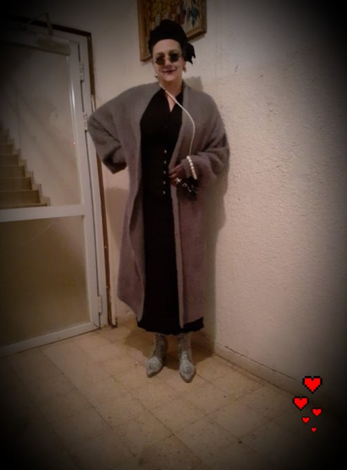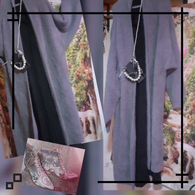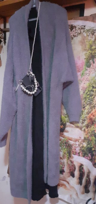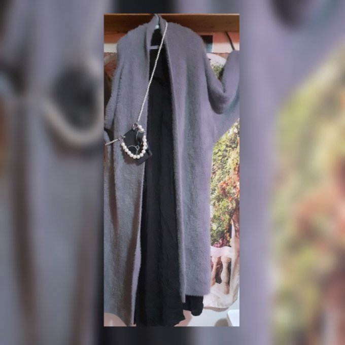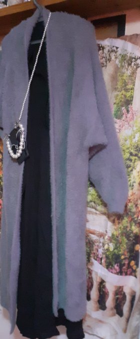 Кардиган оверсайз, думала мне будет как бюстгальтер, а нет, я его постирала и он вытянулся в длину, счастью не было предела, цвет серый с голубым отливо, но меняет цвет в зависимости от освещения, это я приготовила выйти в гости ,платье и кардиган, муж меня пофотал, все фото в его телефоне, не полезу, он спит, не хочу мешать и так пол первого.