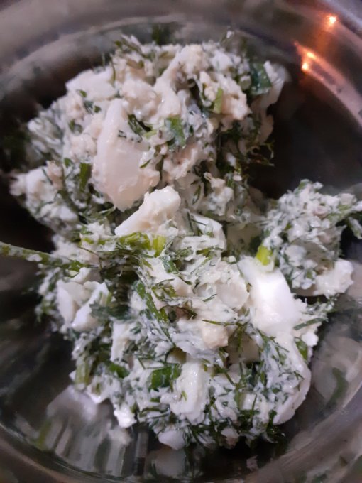 Рекомендую.  Тиляпия отварная. Яйцо. Лук перо,укроп,петрушка, майонез ( маленькая чайная ложка