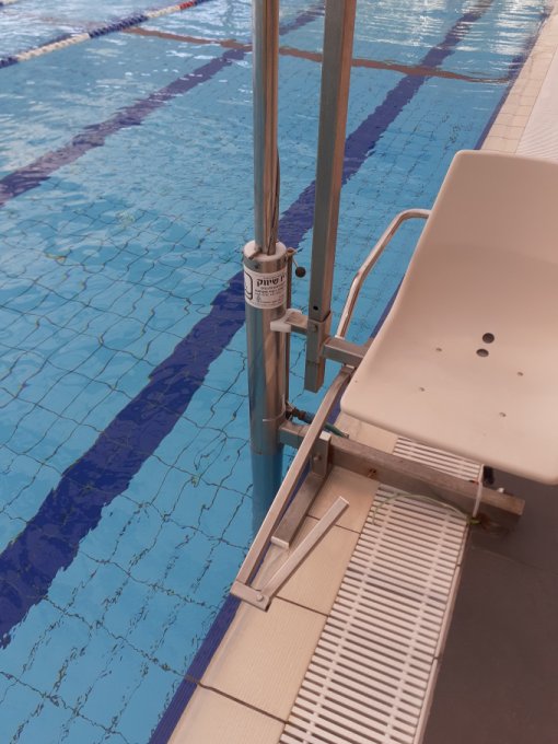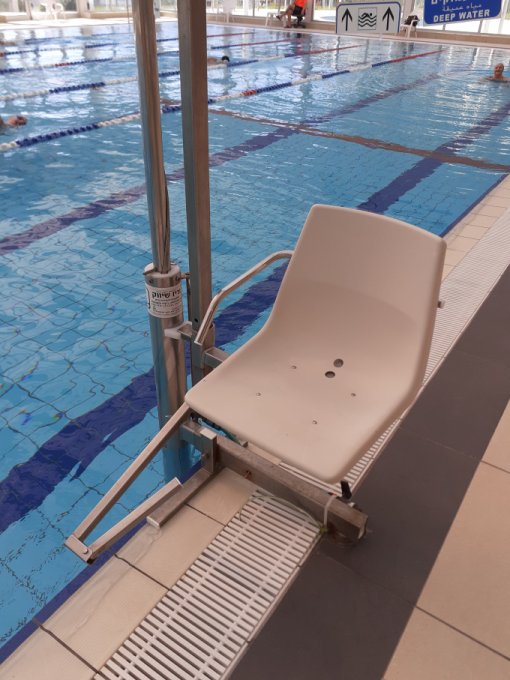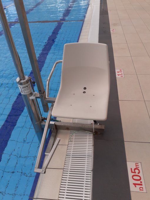 Поднимает и опускает спасатель. Я только помогаю сесть. Рядом с креслом отмечана глубина воды
