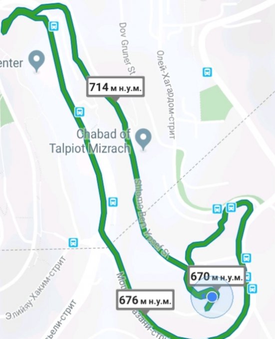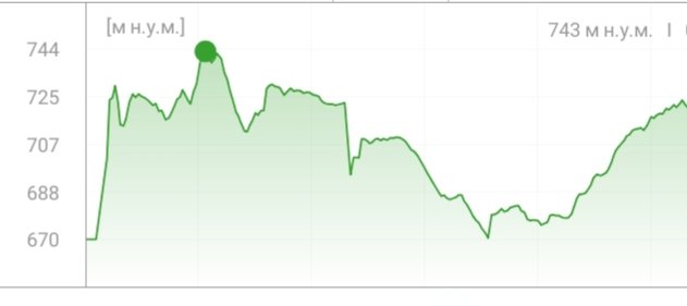 Вот такая прогулка, но не полная. Я иногда забываю включать шагомер. Самая выокая точка где меня сегодня носило 744 м.н.у.м самая низкая 670 м.н.у.м, до каждого метра я не высчитывать все эти перепады не буду, ну приблизно написала